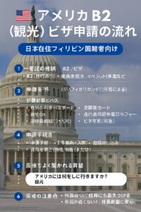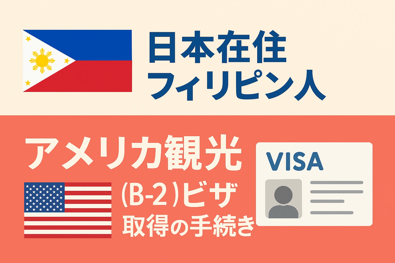フィリピン国籍の方は、一般に米国のビザ免除プログラム(ESTA)対象ではないため、観光目的で最も利用されるのはB-2(観光)ビザです。基本流れは以下の通りです: